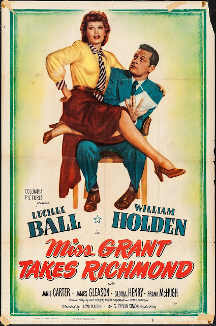 I've always thought William Holden was an underrated comic actor and at his most charming in some of his comedies (Sabrina, Born Yesterday, Moon is Blue). Since he didn't make a lot of comedies, I was looking forward to this one with Lucille Ball. But it's not Holden's film. It's Lucy's film, with Holden playing the straight man. I'm not a big Lucy fan, but she's quite funny in this. Holden, on the other hand, seems a little stiff or disinterested. To be honest, there's not much to work with. Lucy probably succeeds because she's very good at physical comedy and can make us laugh without saying anything, which helps when the script is so weak. Holden's humor tends to come from his intelligence and his timing, which is harder to make work when the screenplay is mediocre or you don't want to be in the film to begin with. Miss Grant Takes Richmond came out the year before Sunset Blvd., so I imagine that Holden's frustration with his roles during much of the 1940s was reaching its peak around this time. But James Gleason and Frank McHugh, two wonderful actors, also seem to struggle a bit in this film, so I pin much of the blame on the writing. There are some funny bits here and there, but it's all a little sugary for me. Lucy fans will probably enjoy it, though - she does the best.